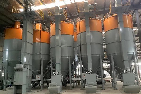 Как правило, на этой автоматизированной линии по производству сухих строительных смесей используется 3–6 силосов для сырья. Два больших силоса вмещают основные материалы, такие как песок и цемент, а в меньших силосах хранятся добавки и второстепенные компоненты.